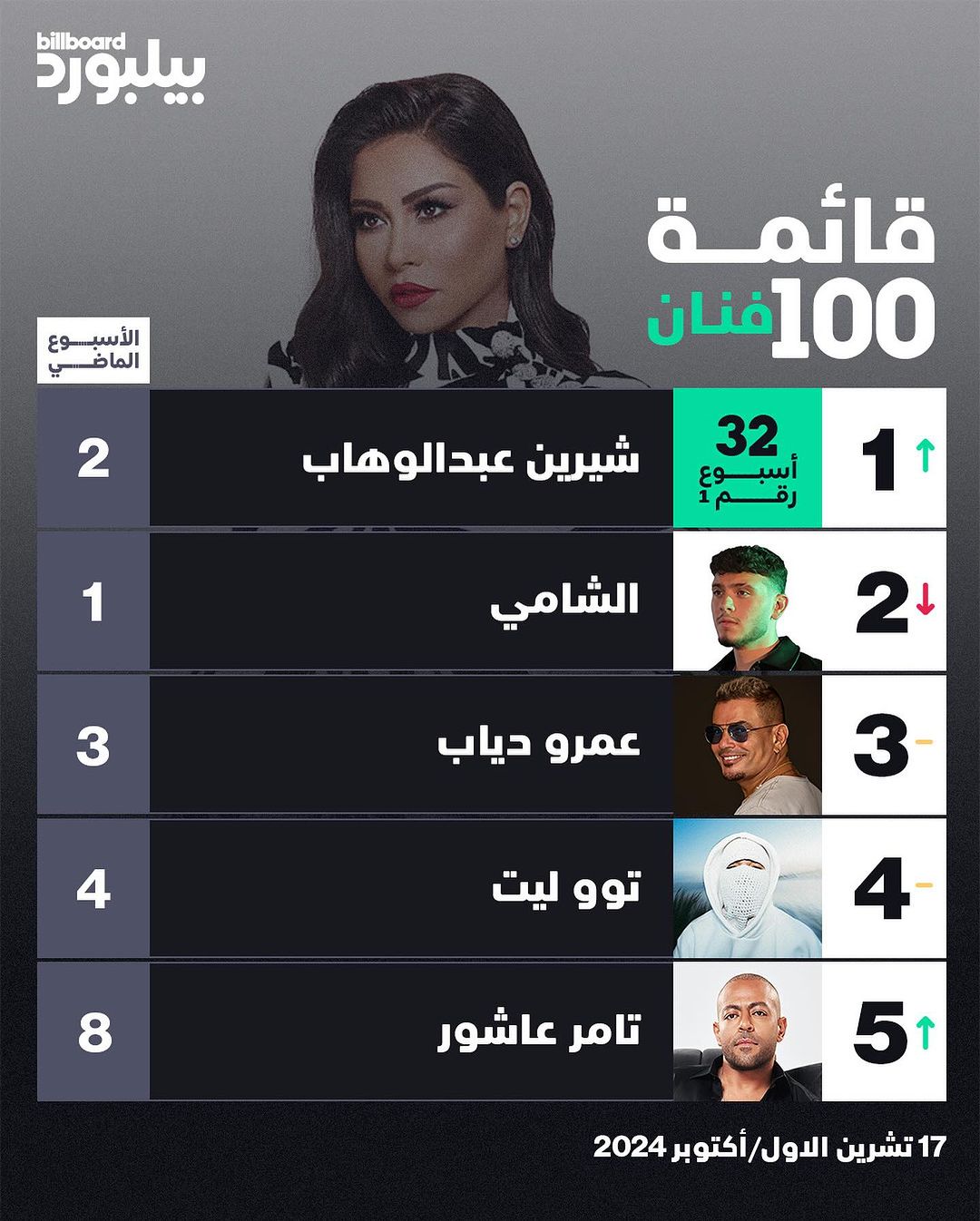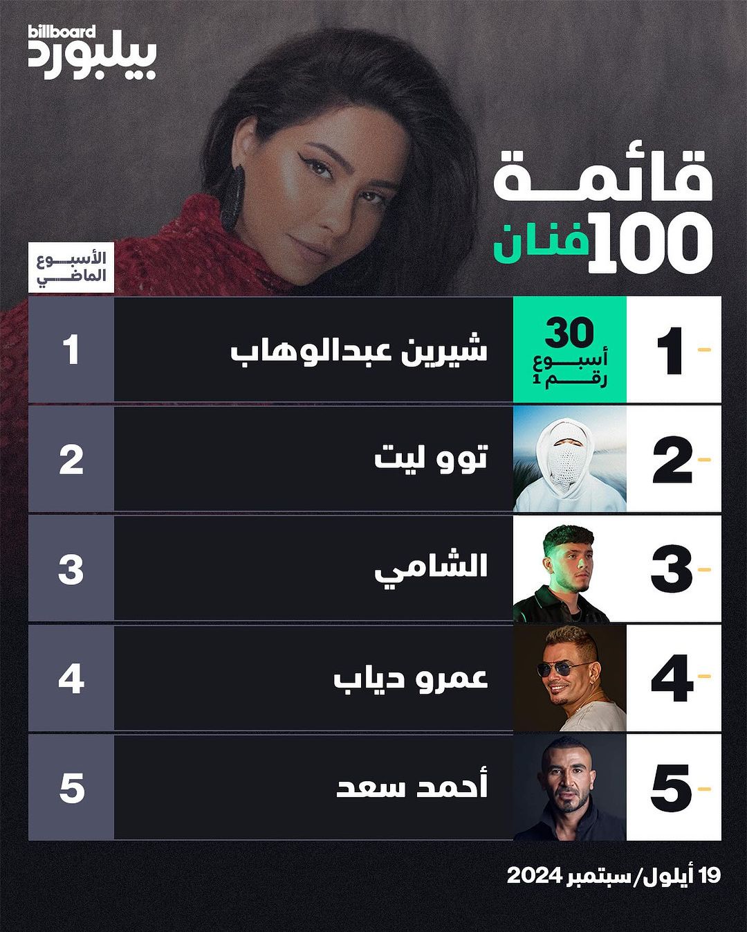 وأعلنت “غينيس” أن الفنان المصري عمرو دياب تصدّر القائمة أيضاً، فهو الفنان المصري الوحيد الآخر الذي وصل إلى المرتبة الأولى لمدة ثلاثة أسابيع في الفترة ما بين 13 إلى 27 كانون الثاني (يناير) 2024.