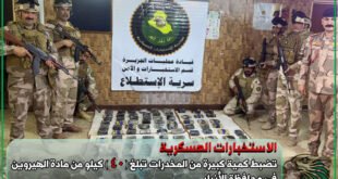 منبر العراق الحر : أعلنت مديرية الاستخبارات العسكرية، اليوم الثلاثاء، ضبط نحو 40 كغم من مادة الهيروين المخدرة في محافظة الأنبار غربي العراق. وقالت المديرية في بيان: إن “ضبط هذه الكمية الكبيرة تم في صحراء الشامية بمنطقة الجمسة التابعة الى محافظة الأنبار، وقد تم التعامل مع المضبوطات حسب السياقات المعمول …