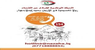 منبر العراق الحر : أعلنت هيئة النزاهة، الثلاثاء، عن إطلاقها الحملة الوطنية للإبلاغ عن الفساد، داعية جميع المواطنين للمساهمة الفاعلة في هذه الحملة والتعاون مع الهيئة في مكافحة الفساد وملاحقة مرتكبيه. وقالت الهيئة في بيان: إنها “ترى الشعب مصدر القوة الأساسي في مكافحة الفساد والقصاص من كبار الفاسدين، حاثة إياهم …