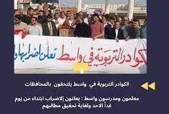 منبر العراق الحر:دشنت الكوادر التربوية في مختلف المحافظات العراقية، اليوم الاحد، اضرابهم عن الدوام، حيث بدأ المعلمون والمدرسون دوامهم الصباحي امام مباني مديريات التربية في كل محافظة، وذلك في اول أيام الدوام بعد انتهاء عطلة العيد. واظهرت مشاهد مصورة ، المئات من المعلمين والمدرسين يتظاهرون امام مبنى مديرية تربية و اسط، فيما …